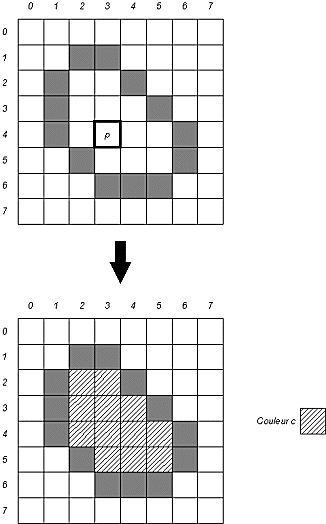 Une image en informatique peut être représentée par une matrice de points m ayant XMAX colonnes et YMAX lignes. Un élément m[x][y] de la matrice représente la couleur du point p de coordonnées (x;y). On propose d'écrire ici une fonction qui, à partir d'un point p, "étale" une couleur c autour de ce point. La progression de la couleur étalée s'arrête quand elle rencontre une couleur autre que celle du point p. La figure suivante illustre cet exemple, en considérant p = (3;4). On propose ici deux façon d'écrire cette fonction. La première solution est récursive. La seconde reprend la première en éliminant la récursivité à l'aide d'une pile. Par la suite, COULEUR sera le type qui représente une couleur, et POINT sera la structure qui représente un point.