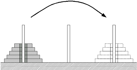Il s'agit d'un jeu de réflexion dont voici la règle. Des anneaux de diamètres différents sont empilés sur un poteau. Un anneau peut être empilé sur un autre seulement si il a un diamètre inférieur à celui de l'anneau sur lequel il repose. Le but du jeu est de déplacer les anneaux initialement empilés sur un seul poteau vers un autre en respectant les règles et en n'utilisant qu'un seul poteau intermédiaire.