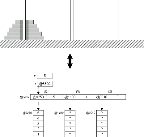 Les poteaux sont représentés par des piles d'entiers numérotées 0, 1 et 2. Le jeu entier sera alors représenté par un tableau t de trois piles. On suppose qu'il y a n anneaux dans le jeu. On attribue à chaque anneau un numéro de manière à ce que si l'anneau a est plus petit que l'anneau b, alors son numéro est plus petit. Au départ, on aura donc: Voici maintenant la fonction qui réalise le déplacement des anneaux du poteau numéro a au poteau numéro b (on déduit le numéro du poteau intermédiaire c par la formule c = 3 - a - b). Cette fonction est récursive. S'il y a un seul anneau, on le déplace directement, sinon on déplace les n - 1 premiers anneaux sur le poteau intermédiaire c (appel récursif à la fonction) et le dernier anneau sur le poteau final b (appel récursif à la fonction). Ensuite, on déplace les anneaux du poteau intermédiaire c sur le poteau final a (appel récursif à la fonction). Voici une illustration. Et voici maintenant le détail de la fonction qui déplace les anneaux.