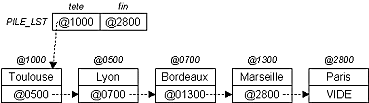 La première façon de modéliser une pile consiste à utiliser une liste chaînée en n'utilisant que les opérations ajouterTete et retirerTete. Dans ce cas, on s'aperçoit que le dernier élément entré est toujours le premier élément sorti. La figure suivante représente une pile par cette modélisation. La pile contient les chaînes de caractères suivantes qui ont été ajoutées dans cet ordre: "Paris", "Marseille", "Bordeaux", "Lyon" et "Toulouse". Pour cette modélisation, la structure d'une pile est celle d'une liste chaînée.