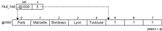 NMAX est une constante représentant la taille du tableau alloué. n est le nombre d'éléments dans la pile.