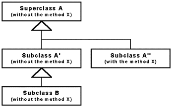 Figure 6 shows a subclass B inheriting from a superclass A, the method X is excluded from the inheritance. Figure 7 describes a solution to avoid this selective inheritance. Simply, the superclass A has not the method X and two intermediate subclasses of A are defined: the class A' which is here identical to A and the class A'' which is completed with the method X. The class B just has to inherit from the superclass A'. Figure 7: A Solution to Avoid the Selective Inheritance.