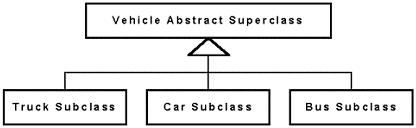 We saw that to define objects, we regroup them in classes according to their similarities. If we regroup objects that have a lot of similarities, we will have a specialized class whereas the regrouping of objects having just some similarities will form a more generalized class. By this way, it is possible that an object of a specialized class also belongs to a more generalized class. This means the specialized class has at least the properties of the more general one. From this statement, we can organize the classes in a hierarchy where the most general classes are divided in more specific classes, and so on. So a relationship between a generalized class, the "superclass", and one of its specialized classes, the "subclass" is called "inheritance". A subclass inherits the characteristics of its superclass. This means the methods and the attributes of the superclass are given to the subclass. New attributes and methods can also be added to the subclass to define its specific characteristics. Moreover the inherited methods can be modified or replaced. For more information, see further the paragraph about polymorphism. Booch calls the hierarchy of inheritance "class structure", referring to the concept of hierarchy defined previously. With this classification, classes can not always be instantiated. Figure 5 shows the example of a superclass Vehicle specialized in three subclasses Truck, Car and Bus. It is possible to instantiate objects like a truck, a car or a bus whereas it is impossible to instantiate a vehicle object directly. Such an object has no signification. Classes like Vehicle are qualified as "abstract". Their purpose is only organizational. Figure 5: An Example of Abstract Class.