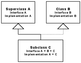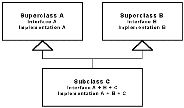 Multiple inheritance brings a lot of problems. Hence, the Java language has been built with a new approach ([Niemeyer 97]). As we saw before, a class has a public part, the interface, and a private one, the implementation. When a class inherits from a superclass, the subclass inherits its interface and its implementation. Figure 11: Interface and Implementation with Multiple Inheritance.