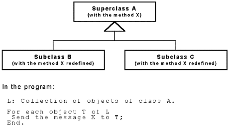 We saw that a subclass inherits the structure and the behavior of its superclass. Then, it is possible to complete them by adding new data or new methods. But it is also possible to modify or replace completely a method. For that, the programmer is allowed to create a new method that has the name of an inherited method. He writes the code he wants in it, he can even call the inherited method having the same name in the superclass. This new method will replace the inherited method. This action is called "overriding". This means that when a message is sent to the object with the name of an overridden method, this is the last method defined in the inheritance hierarchy that will be executed. But there is something more interesting presented by [Booch 91] and [Hill 96]. Figure 10 shows a graph of inheritance. The superclass A defines a method X and its subclasses B and C redefine the method X as we explained above. Now, we consider a collection of objects. In the program, we only know that they belong to the class A. But they can belong to the subclass B or C. Imagine we send the message X to each object of the collection, knowing only that they belong to A. If the object belongs just to the class A, the method X of this class will be called, but if the object belongs to the class B or C, the method X of these classes will be called, whereas we do not even know that the object belongs to one of these classes. But an internal mechanism identifies the class of an object and finds the right method to call.