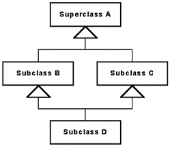 Some languages allow the multiple inheritance. That means a class can inherit characteristics from more than just one superclass. This kind of inheritance is not a standard of OO because it rapidly presents a lot of ambiguities. [Hill 96] presents the problem of repeated inheritance illustrated by Figure 8. In fact, the class D inherits several times the properties of the class A through the multiple inheritance of B and C. There are three approaches to deal with this problem ([Booch 91]). First, the repeated inheritance can be considered as illegal. Second, the repeated inheritance can be accepted, but to use the methods duplicated, the class from which they are inherited must be specified. Third, when a method of a class appeared several times in a subclass, only one copy is kept. Figure 8: Repeated Inheritance.