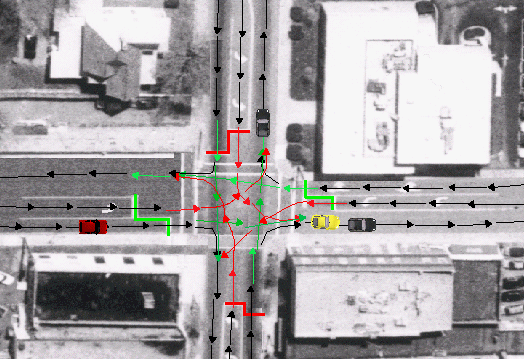 Finally, we studied a model of the road traffic in the town of Blacksburg. The purpose of this model was to determine the rules to change the color of the intersection lights of the roads. Hence, the model represents vehicles moving in the streets of the town, respecting the common rules when arriving at a light or stop intersection. It had been decided to model this problem with spots between which the vehicles can move. Then, at each intersection, particular spots were defined to represent the specific rules to apply there (see Figure 3). The result was a really complex model, difficult to verify and debug, with numerous kinds of spot. Although the reuse of the components of this model for another road traffic was possible, it did not seem really easy to us. Figure 3: Example of a Road Intersection.