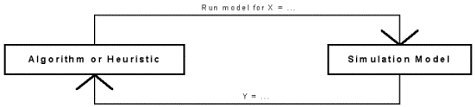 When a knowledge model is defined, a method to solve it must be chosen. Sometimes, analytical methods can be used, but unfortunately, the problems solved by these techniques are limited. Analytical methods imply a lot of simplification from the original system, which limits the complexity of the systems studied. Other times, the analytical resolution is virtually possible but request too much computation time. For these reasons, simulation appears often to be the best solution to solve problems concerning very complex systems. Simulation presents a lot of advantages ([Banks 96]) compared to other methods. But important critiques are usually made concerning the difficulty of learning the modeling techniques and analyzing the results. Moreover, it stills time consuming and expensive. However, as we will see further, vendors of simulation software develop packages providing generic solutions for a category of system, output analysis capabilities and exploit the graphic possibilities of computers to make the learning and the use of the software easier. Finally, the advances in hardware allow simulation to be executed faster every day. [Rothenberg 89] presents some limitation in using simulation to solve problems. He explains that simulation answers questions like "What if X ?" but simulation usually can not answer directly to questions like "Why did X happen ?", "When does X happen ?", "How can X be done ?", "Can ever / never X happen ?" or optimization questions such as "What is the highest value of X ?". However, in these cases, simulation may be used as part of a whole solver. For instance (see Figure 15), in the case of the optimization of a criterion, it exists algorithms and heuristics to progressively find the best solution or to approach it. However, these algorithms may need estimations of the performances of the system for a given value of the criterion in order to evaluate the quality of the value proposed. And sometimes, the only way to do it is a simulation. In the coupling of an optimization method with a simulation model, the algorithm or the heuristic is the main procedure that runs a simulation when it is needed. Figure 15: Coupling Algorithm / Heuristic and Simulation Model.