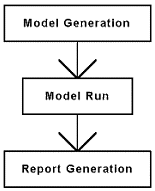 The execution of a program can be separated in three main steps ([Gordon 78]) as presented by Figure 17. The first phase is the generation of the model. The entities of the model are created, initialized and the first events may be scheduled, according to the world view considered. By this way, the model is prepared to be run. Then, the model is run, time is increased, events occur, activities are performed until the time reached a given limit or until there is no more activity to execute. This means no event matches with the conditions (in the case of an activity-scanning world view) or no event is scheduled (in the case of an event-scheduling world view). During the running, data is collected. Finally, results are reported, meaning the data collected is organized, and eventually statistical analysis is performed. Figure 17: Steps of a Simulation Program.