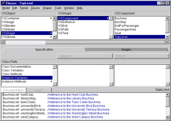 This window allows the user to define classes for the purpose of his modeling. Like in every object-oriented language, VSE allows the user to define its own classes and allows him to structure them with the concept of inheritance. By default, VSE provides a set of classes that performs the basic operations in the model. From these standard classes, the user must inherit his own ones. As shown by Figure 19, the upper part of the window defines the graph of inheritance. If reading from the left to the right, we see the hierarchy from the most generalized classes to the most specific ones. The classes beginning by the letters VS are classes provided with the standard library of VSE. In this example, we see that the class VSShape has the subclasses VSComponent, VSEntrance, VSExit... Then, the class VSComponent has the subclasses BusArea, BusStop, ExitForPassenger...
