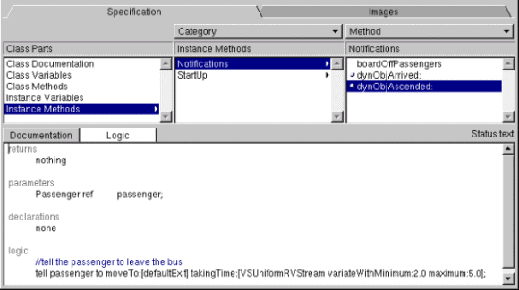 VSE does not allow the multiple inheritance. It is justified by the fact that this kind of inheritance can induce different kinds of ambiguity ([Hill 96]). Moreover, the characteristics wanted for the multiple inheritance can be replaced by some well-known patterns we describe in the chapter about the OO approach. Finally, VSE allows the dynamic binding that avoids often using the multiple inheritance. We will discuss this dynamic binding further when we will describe the standard library of VSE. After a class has been placed in the inheritance hierarchy, its attributes and its methods must be defined. For this, VSE provides an editor, in the lower part of the window. A distinction is clearly established between class and instance characteristics. Attributes can be defined as shown by Figure 19. In a same way, methods can be defined in a language wanted to be as natural as possible (see Figure 20). The methods can be organized by category, which has no effect on the model. The overriding of the methods is allowed. That means the methods inherited can be modified or completely rewritten, which is a powerful concept for reusability. Figure 20: An Example of Method Definition.