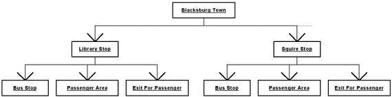 To illustrate our purpose, we will consider a bus system, in the town of Blacksburg. The buses move between stops, picking up customers and bringing them to another stop. A model of the static part of this system is shown by Figure 24. The main component is the town of Blacksburg. It is composed of stops, between which the buses move. Each stop is decomposed in components representing more precisely the area where the buses stop, the area where the customers wait and a component through which the customers leave the stop. This defines the static hierarchy of the model. Figure 24: An Example of Static Hierarchy.