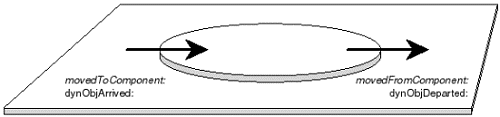 After we defined separately the particularities of a component and a dynamic object, let us see now how both of them interact. There are different cases of movement for a dynamic object in a component. First of all, we can separate them according to the fact that the dynamic object moves in a deep component or on a shallow one. The first case is illustrated by Figure 31. Figure 32 represents the other one. Both of them show the messages automatically sent by the simulator. Let us consider the case of a dynamic object arriving on a shallow component. When it is arrived, the message movedToComponent: is sent to the arrived object and the message dynObjArrived: is sent to the component the object has just arrived on. In a same way, when the object is departed from the component, the message movedFromComponent: is sent to the dynamic object and then, the message dynObjDeparted: is sent to the component the object has just left. Although there is an order in the passing of the messages, this happens without changing the time of the simulation. In other words, from the point of view of the simulation time, the two events appear at the same time. Figure 31: Movement on a Shallow Component and the Automatic Message Passing.