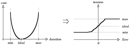 To solve this problem of minimum cost tension, we adapted the out-of-kilter method. This method consists in defining for each arc a curve called kilter curve. The appearance of the curve depends on the kind of cost considered for the arcs. An arc will be said in-kilter if its couple (flow;tension) is on the curve. In the linear case, here is the curve. Then we can demonstrate that if all the arcs of the graph are in-kilter, then the tension has the minimum cost. Hence our problem will be solved. The difficulty consists finally in making all the arcs in-kilter. In order to do that, we proceed by successively modifying the flow and the tension to move progressively all the arcs toward their kilter curve. In the convex case, this is a bit more complicated, because the kilter curve is continuous. Our method can not work correctly with this kind of curve. Hence, we have to approximate it by a stepped curve, first vaguely, then the more the arcs move toward their kilter curve, the more the staircase approximation is precise, until the wanted precision.