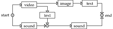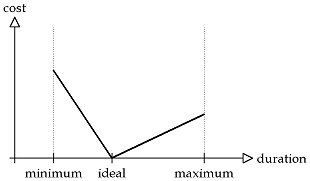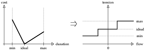 To present these problems of design and presentation of an hypermedia document, think as we were the author of such a document. We suppose we have prepared videos, sounds, images, texts... Now we must formulate the running of the presentation. The following diagram is a way to do so. It is read this way: at the beginning of the presentation, a video and a sound are played simultaneously. When the video ends, an image and some text are displayed. Moreover, the end of the sound and the end of the text must occur at the same time. In other words, if we add the duration of the video and the duration of the text, the result must be exactly the duration of the sound. However, each object has been made previously with a fixed duration (the ideal duration). So the chance is slight for the equality to be possible. That is why during the design of an object, we add a tolerance to the planned duration. The first question we can think of is to know if the diagram built by the author is feasible. This problem can be solved quite easily. Then, we can ask ourselves what are the minimum and maximum durations of presentation of the document. Here too, answering to this question is quite simple. But the main problem, that is very hard to solve, is to schedule the duration of each multimedia element in order to fulfil the diagram constraints. All this by avoiding to be too far from the ideal durations. To solve this problem, we decide to set a cost to each object that depends on its duration. Here are two kinds of cost we are interested in. They seem to us to be representative of the real problem. The first is a piecewise linear cost, the second is a convex cost. In both cases, we see that if an object is presented with its ideal duration, then the associated cost is null. On the other hand, the more the duration moves from its ideal value, the more the cost increases. Hence, the problem consists in scheduling the durations for the objects such as the sum of the costs is as small as possible, which we suppose to be representative of the best quality for the document. Finally, the resolution of the problem with convex costs appears to be more difficult than with linear costs.