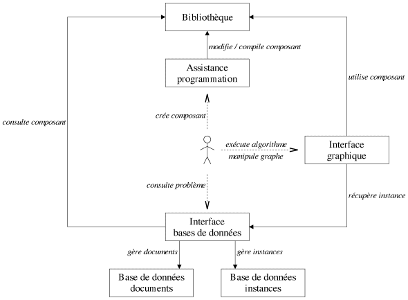 Nous avons présenté dans cette dernière section l'état d'avancement de notre bibliothèque et les modifications éventuelles assez immédiates que nous pourrions lui apporter. Nous expliquons maintenant très sommairement le rôle que nous souhaitons donner à cette bibliothèque dans une ambition à long terme de fournir un environnement de développement pour les problèmes de graphes, comme il en existe déjà dans de nombreux domaines, notamment la conception de logiciels et la simulation. Très brièvement nous présentons les différents outils que nous imaginons dans cet environnement résumé par la figure 8.15.