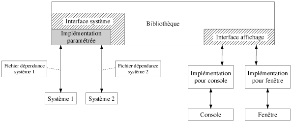 Le langage C++ n'est pas un langage totalement indépendant du système (système d'exploitation + compilateur) avec lequel il interagit. Un standard existe mais il reste malheureusement quelques ambiguïtés. La meilleure manière de rendre notre bibliothèque indépendante du système est de proposer une interface unique permettant à la bibliothèque de communiquer avec n'importe quel système. Le portage de la bibliothèque sur un nouveau système consistera donc simplement à implémenter l'interface. Pour simplifier cette étape, il est possible d'isoler dans quelques variables le peu de différences qu'il existe entre les implémentations de l'interface pour différents systèmes. Dans notre bibliothèque, un fichier source, dit de dépendance, très court, rassemble ces variables. Une partie de la figure 8.12 illustre le principe. Pour tester cette approche, nous avons compilé notre bibliothèque sur
