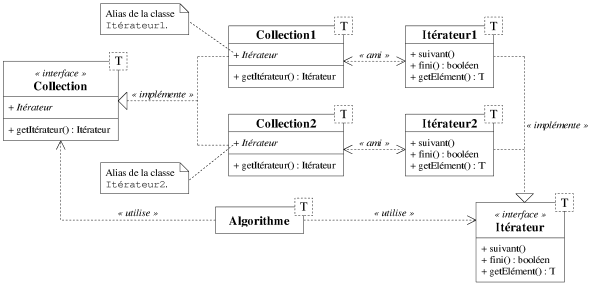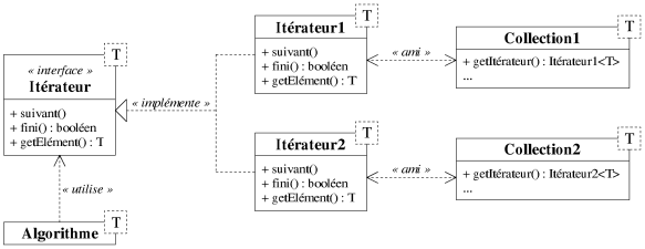 Dans notre discussion, nous considérerons l'exemple d'une procédure qui parcours tous les éléments d'une collection et leur applique un traitement, et nous nous intéresserons à rendre son code unique pour tout type de collection. Le principe consiste à intercaler, pour chaque collection, une classe entre la collection et les algorithmes qui la manipulent. Cette classe possède la même interface quelque soit la collection. En l'utilisant de préférence aux méthodes propres à la collection, les algorithmes deviennent plus indépendants de la structure qu'ils manipulent et les collections plus facilement interchangeables. L'interface qui convient à notre exemple est un itérateur, il s'agit d'un patron de conception proposé dans [Gamma95] et exploité intensivement dans la bibliothèque STL. L'interface d'un itérateur propose la fonctionnalité de déplacement dans
