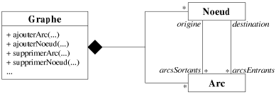 Penchons-nous tout d'abord sur les différentes façons de modéliser la structure d'un graphe. La figure 8.1 montre de manière très générale comment représenter en orientation objet cette structure. Nous considérons ici que le graphe est composé (au sens objet) d'arcs et de noeuds, il est donc chargé de les gérer entièrement. Nous ne nous intéressons pas à la représentation même du graphe, c'est-à-dire si le graphe est représenté par une matrice d'adjacence, une matrice d'incidence, une liste d'adjacence (cf. chapitre 2)... Notre propos est justement de discuter d'une manière qui permet d'abstraire de tels détails pour les algorithmes. Ces derniers doivent être applicables indépendamment de la structure véritable du graphe, et ce avec le maximum d'efficacité.