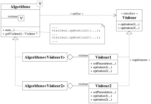 Pour éviter finalement le mécanisme de virtualité, il suffit de fournir le visiteur en paramètre et non pas en argument à l'algorithme, autrement dit ce dernier doit être un patron paramétré sur le type du visiteur qu'il manipule. Celui-ci doit alors simplement implémenter le concept de visiteur nécessaire à l'algorithme. La figure 8.10 illustre cette approche. L'exemple suivant montre que l'utilisation du visiteur est très similaire à l'approche précédente, la seule réelle différence à ce niveau étant que l'utilisateur n'a pas à créer explicitement de visiteur.
