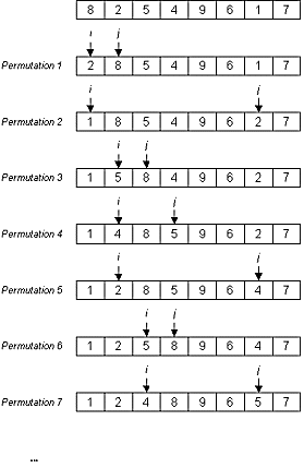 Cette méthode est très simple. Supposons que l'on veuille trier les n éléments du tableau t. On commence par parcourir le tableau pour trouver la plus petite valeur. On la place à l'indice 0. Ensuite, on recommence à parcourir le tableau à partir de l'indice 1 pour trouver la plus petite valeur que l'on stocke à l'indice 1. Et ainsi de suite pour l'indice 2, 3 jusqu'à n - 2. La figure suivante montre comment l'algorithme fonctionne sur un tableau de 8 éléments. Seulement quelques étapes sont représentées. La fonction se déroule de la manière suivante. Le tableau est parcouru du premier élément (indice 0) à l'avant dernier (indice n - 2). On note i l'indice de l'élément visité à une itération donnée. On compare l'élément i avec chaque élément j qui suit dans le tableau, c'est-à-dire de l'indice i + 1 jusqu'à l'indice n - 1. Si l'élément d'indice j est plus petit que l'élément d'indice i alors on permute i et j dans le tableau. Voici le détail de la fonction de tri.