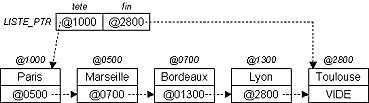 Par convention, un pointeur sur rien aura la valeur VIDE = -1. La figure suivante représente une liste chaînée par cette modélisation. La liste contient les chaînes de caractères suivantes classées dans cet ordre: "Paris", "Marseille", "Bordeaux", "Lyon", "Toulouse". Voici la structure de données correspondant à une liste chaînée représentée par tableau.