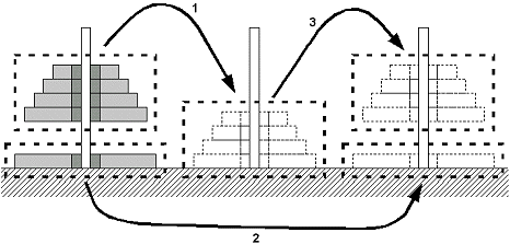 Il s'agit d'un jeu de réflexion dont voici la règle. Des anneaux de diamètres différents sont empilés sur un poteau. Un anneau peut être empilé sur un autre seulement si il a un diamètre inférieur à celui de l'anneau sur lequel il repose. Le but du jeu est de déplacer les anneaux initialement empilés sur un seul poteau vers un autre en respectant les règles et en n'utilisant qu'un seul poteau intermédiaire.