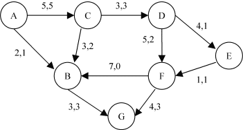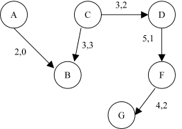 Voici un réseau transport dans lequel circule un flot. Le graphe d'écart correspondant est le suivant. (A,B,C,D,F,G) est un chemin pour aller de A à G. On peut augmenter le flot de: