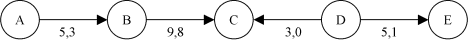 Voici une chaîne augmentante de A à E faisant partie d'un réseau de transport. Dans cette chaîne, on peut augmenter le flot de: