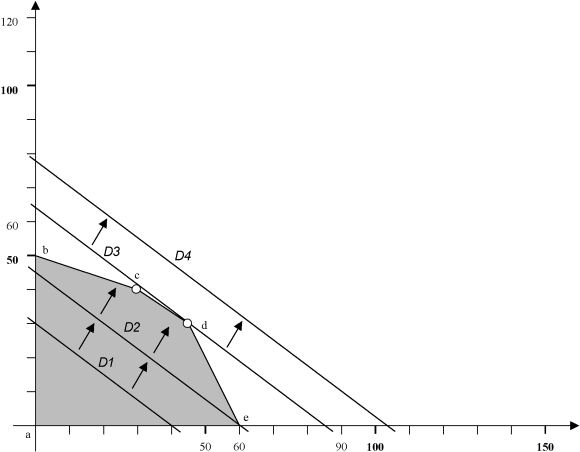 Les solutions admissibles sont représentées par la zone grisée (a,b,c,d,e). Ce sont les solutions qui satisfont les contraintes. Considérons maintenant la fonction z = 3x + 4y. Pour z = 120, on a une droite D1, 3x + 4y = 120, qui représente les solutions pour lesquelles le profit vaut 120. Si z = 180, on a une autre droite D2, 3x + 4y = 180, qui représente les solutions pour lesquelles le profit vaut 180. On remarque que D2 est parallèle à D1 et on s'aperçoit facilement qu'en déplaçant la droite vers le haut on augmente le profit z. Donc pour résoudre graphiquement le problème, on va faire "glisser" la droite vers le haut jusqu'à ce qu'elle ait un minimum de points communs avec la surface grisée. Le point restant ici est d. Il représente la solution pour laquelle le profit est maximum. En effet, si on prend un profit plus important, représenté par exemple par D4, on s'aperçoit que toutes les solutions sont en dehors de la surface grisée. Donc la solution du problème est de produire 45 produits X et 30 produits Y pour obtenir le profit maximum de z = 3x + 4y = 255 francs.