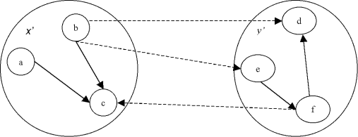 Tout d'abord, si on choisit un arc u = (x;y) où x et y sont des noeuds qui ne sont pas le résultat d'une fusion, on peut dire que le graphe résultant ({x,y};{u}) est un arbre de poids minimum. Maintenant, si on choisit un arc u = (x';y') où x' et y' sont des noeuds qui sont le résultat de fusions, la figure ci-dessous peut représenter la situation. En fait, x' et y' représentent des arbres de poids minimum (hypothèse de récurrence). Si u' est l'arc entre x' et y' de poids minimum, le graphe ({a,b,c,d,e,f};{(a;c),(b;c),(d;f),(e;f),u}) sera un arbre de poids minimum. Donc à la dernière étape de l'algorithme, on obtiendra bien un arbre de poids minimum qui est un graphe partiel de G.