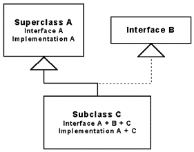 Multiple inheritance brings a lot of problems. Hence, the Java language has been built with a new approach ([Niemeyer 97]). As we saw before, a class has a public part, the interface, and a private one, the implementation. When a class inherits from a superclass, the subclass inherits its interface and its implementation. Figure 11: Interface and Implementation with Multiple Inheritance.