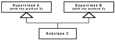 [Booch 91] presents also the problem of name collision. Imagine two classes A and B totally independent with the same name X for a method. The object C inheriting from both the classes A and B will be confused about the methods with the same name X. Like for the repeated inheritance, different approaches are proposed to avoid the problem. First, the collision is considered illegal. Second, a method with the name X must be defined explicitly from one of the two methods X inherited. Third, it can be possible to call the method by specifying explicitly which class to use. Figure 9: Name Collision in Multiple Inheritance.