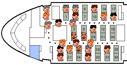 In a same way, we modeled partially an air traffic. We considered the flight of airplanes between three American cities. In this representation, we also modeled the boarding and the landing of the passengers in the airplane. To obtain a visually acceptable modeling of the movement of the passengers in the airplane, we defined spots between which the passengers can move (see Figure 2). During the boarding, the passengers enter the airplane with an assigned seat and they must find it. Hence, the interaction between spots and passengers has been defined to assure the passengers to move to their seat. To perform a simple animation like this one, the design took some time and resulted in a reasonably complex model. Figure 2: Example of a Boarding in an Airplane.