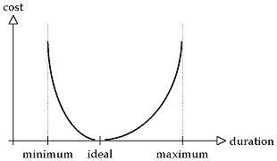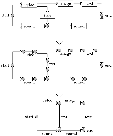 To present these problems of design and presentation of an hypermedia document, think as we were the author of such a document. We suppose we have prepared videos, sounds, images, texts... Now we must formulate the running of the presentation. The following diagram is a way to do so. It is read this way: at the beginning of the presentation, a video and a sound are played simultaneously. When the video ends, an image and some text are displayed. Moreover, the end of the sound and the end of the text must occur at the same time. In other words, if we add the duration of the video and the duration of the text, the result must be exactly the duration of the sound. However, each object has been made previously with a fixed duration (the ideal duration). So the chance is slight for the equality to be possible. That is why during the design of an object, we add a tolerance to the planned duration. The first question we can think of is to know if the diagram built by the author is feasible. This problem can be solved quite easily. Then, we can ask ourselves what are the minimum and maximum durations of presentation of the document. Here too, answering to this question is quite simple. But the main problem, that is very hard to solve, is to schedule the duration of each multimedia element in order to fulfil the diagram constraints. All this by avoiding to be too far from the ideal durations. To solve this problem, we decide to set a cost to each object that depends on its duration. Here are two kinds of cost we are interested in. They seem to us to be representative of the real problem. The first is a piecewise linear cost, the second is a convex cost. In both cases, we see that if an object is presented with its ideal duration, then the associated cost is null. On the other hand, the more the duration moves from its ideal value, the more the cost increases. Hence, the problem consists in scheduling the durations for the objects such as the sum of the costs is as small as possible, which we suppose to be representative of the best quality for the document. Finally, the resolution of the problem with convex costs appears to be more difficult than with linear costs.