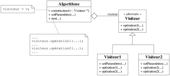 L'exemple suivant montre la flexibilité apportée par la technique dans l'extension des algorithmes. Il est en effet possible de définir à l'exécution quel sera le visiteur d'un algorithme. Il faut noter que le visiteur peut avoir ses propres paramètres et qu'ils doivent être initialisés avant l'appel à l'algorithme principal.