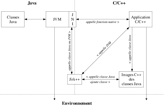 Afin de permettre une réelle interaction entre notre bibliothèque et Java, nous avons proposé une modélisation C++ qui permet de manipuler directement et très simplement un composant Java en C++. Chaque classe Java possède une représentation C++, et c'est cette classe qui est appelée en C++, elle délègue ensuite toute exécution à son équivalent Java (cf. figure 8.14). De plus amples détails sur ce mécanisme, appelé Jirk++, sont disponibles dans [BacheletWeb]. Cette interopérabilité suscite quelques intérêts puisque la bibliothèque GTL propose une version, GTL Java, qui utilise JNI pour permettre de manipuler ses composants en Java. Il existe également des outils commerciaux plus généralistes, équivalents à Jirk++, qui facilitent le développement de logiciels à fort couplage C++/Java (e.g. JunC++ion [CodemeshWeb], JNI Assistant [KeyTechnologyWeb]).