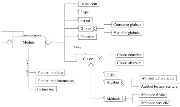 Cela dépend du langage et des concepts employés, mais aussi des outils utilisés pour générer la documentation qui ont tendance à favoriser une certaine vision. Pour notre bibliothèque, nous avons choisi une représentation qui reflète notre organisation en modules des composants. Nous proposons ici un schéma UML simplifié qui résume dans les grandes lignes cette organisation. La figure 8.11 indique qu'un module est composé de trois fichiers sources: l'interface, l'implémentation et la procédure de test. Un module peut être décomposé en sous-modules. Chaque module contient des objets globaux (variables ou constants), des fonctions, des types, des erreurs (objets représentant les informations des erreurs que le module est susceptible de produire) et des classes. Chaque module contient également un initialiseur, objet chargé de gérer la création (avant la première utilisation du module) et la destruction (après la dernière utilisation du module) de ses objets globaux (nous revenons à la section suivante sur son utilité). Notre représentation ne met pas en avant la hiérarchie d'héritage comme la plupart des générateurs de documentation. La raison en est très simple: nous employons principalement les patrons et la composition à la place de l'héritage, contrairement à beaucoup de développements orientés objet.