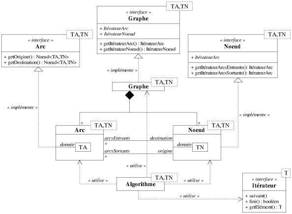 Penchons-nous tout d'abord sur les différentes façons de modéliser la structure d'un graphe. La figure 8.1 montre de manière très générale comment représenter en orientation objet cette structure. Nous considérons ici que le graphe est composé (au sens objet) d'arcs et de noeuds, il est donc chargé de les gérer entièrement. Nous ne nous intéressons pas à la représentation même du graphe, c'est-à-dire si le graphe est représenté par une matrice d'adjacence, une matrice d'incidence, une liste d'adjacence (cf. chapitre 2)... Notre propos est justement de discuter d'une manière qui permet d'abstraire de tels détails pour les algorithmes. Ces derniers doivent être applicables indépendamment de la structure véritable du graphe, et ce avec le maximum d'efficacité.