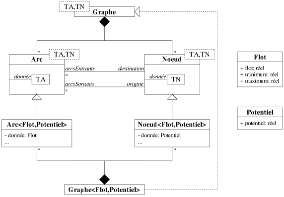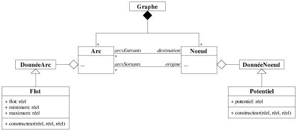 En résumé, la modélisation du graphe avec une approche par héritage entraîne une perte de temps due au downcast, certes plus faible que la virtualité. Cependant, en observant de plus près les algorithmes qui manipulent cette structure, on s'aperçoit que les méthodes d'accès aux données des noeuds et des arcs doivent être le plus souvent virtuelles afin de permettre une plus grande réutilisabilité des algorithmes. Tous les défauts que nous avons énumérés ici portent sur l'efficacité de la modélisation. Il faut tout de même noter que l'effort à fournir ici pour décrire les données portées par le graphe est minimal et que cette représentation permet, contrairement à celle qui suit, de stocker des données de types variés sur les arcs et les noeuds du graphe, ce qui offre une certaine souplesse qui peut être appréciable, non pas pour la recherche opérationnelle, mais pour la simulation par exemple (cf. [Bachelet98]).