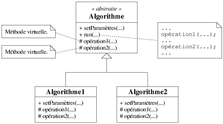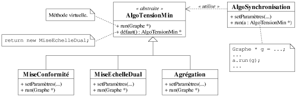 Nous proposons ici trois manières de rendre un algorithme extensible, l'idée étant que certaines parties de l'algorithme sont déléguées dans des méthodes qui peuvent être remplacées par le réutilisateur. Dans la suite de notre discussion, même si les figures ne le montrent pas toujours, nous considérons que les algorithmes suivent le patron stratégie, avec les évolutions proposées à la section précédente, à savoir une méthode pour paramétrer chaque algorithme et une méthode de classe qui fournit l'algorithme le mieux adapté.
